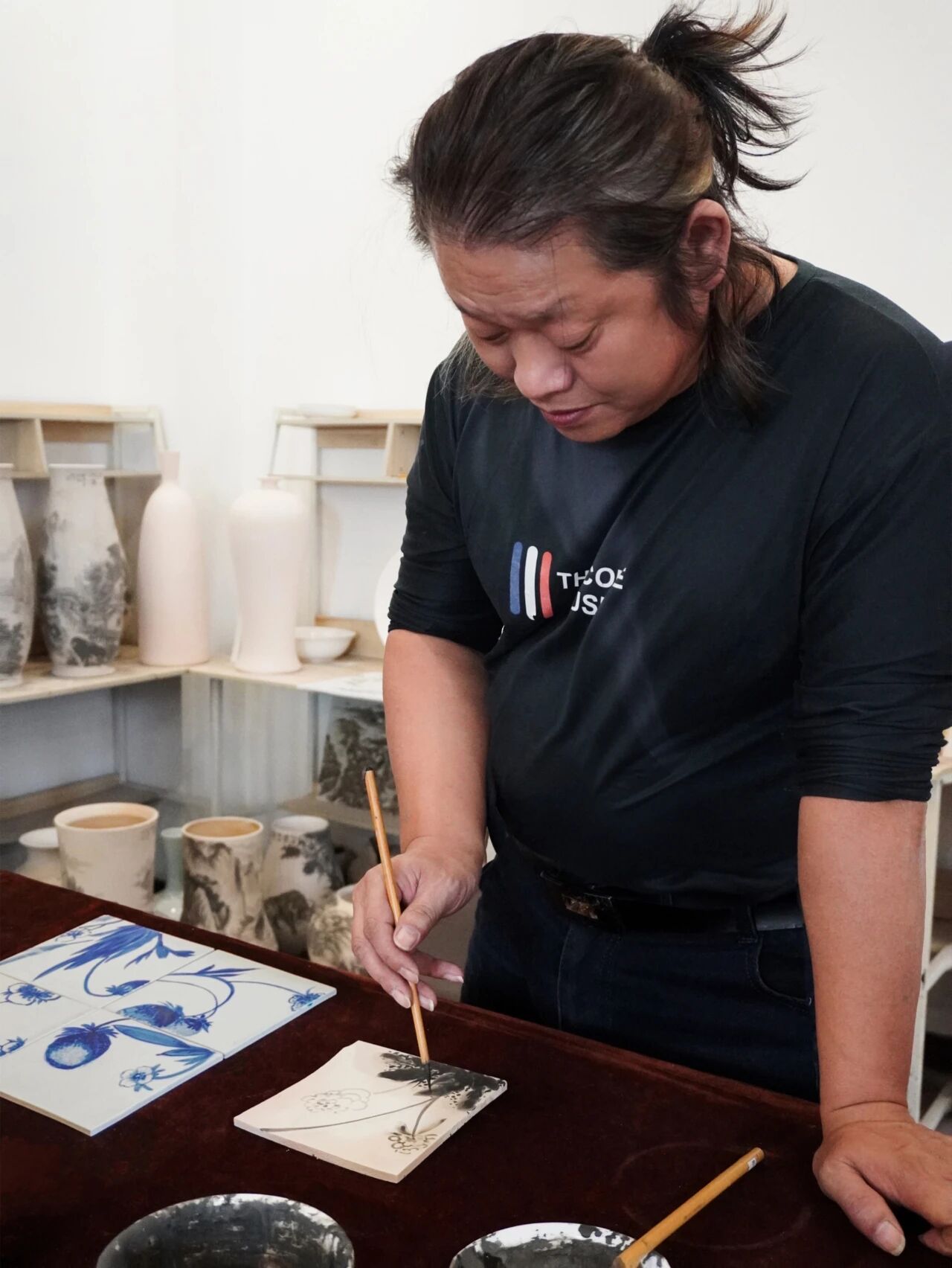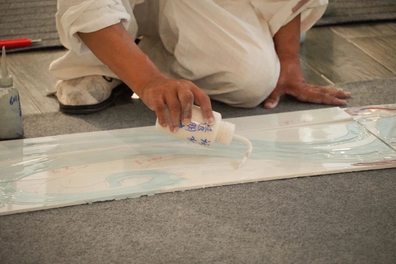 陶藝風(fēng)帆—巧妙地將瓷板切割并組裝成模擬海上揚帆遠航的帆船形態(tài),其上的畫面細膩地還原了海浪。創(chuàng)作過程中,畫師首先精心勾勒出帆船的輪廓與海浪的動勢,隨后,一塊塊填上色彩,每一筆都蘊含著極致的細膩與匠心。