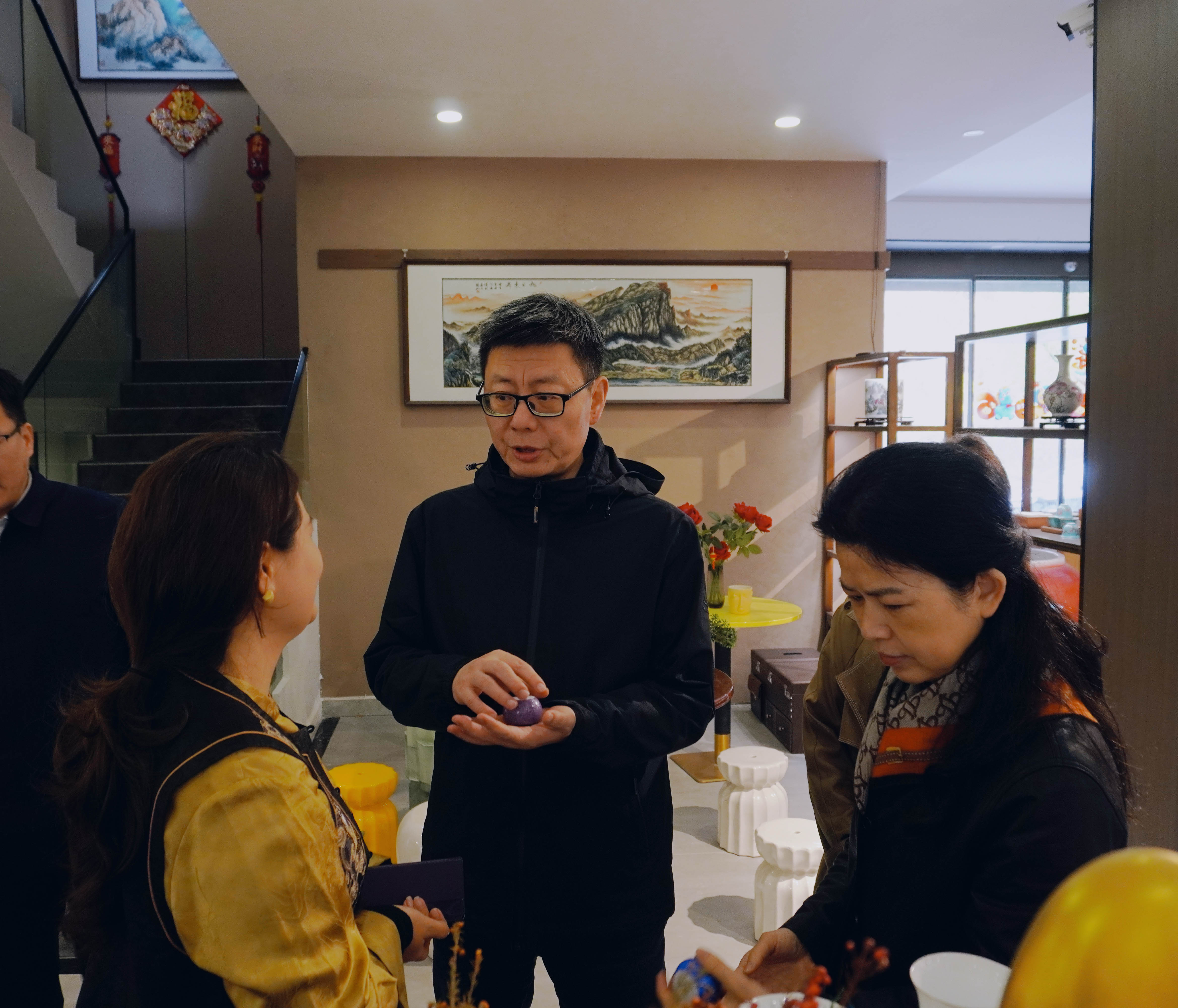 從潮流文創(chuàng) IP 衍生擺件,到高端奢牌定制案例展示,羅文軍副市長駐足端詳,認真詢問產品設計理念、工藝特色及海外市場布局情況。